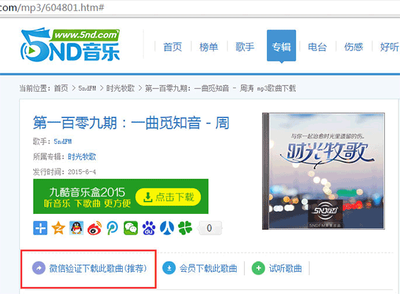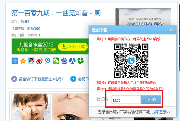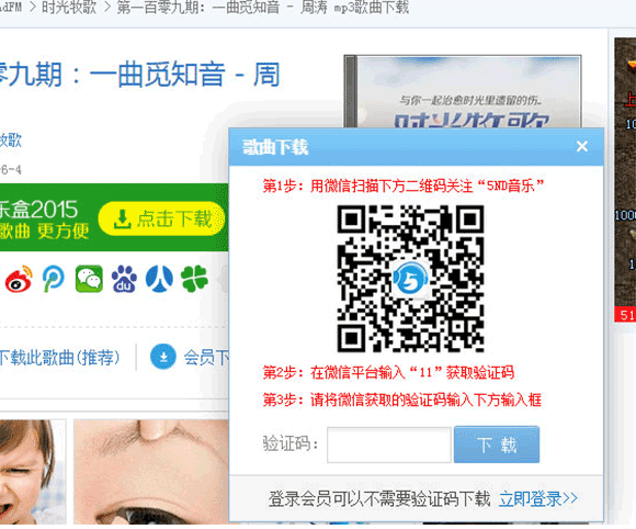 如果下載頁面顯示的是:“微信驗證下載此歌曲(推薦)”,這證明您沒有通過微信獲取驗證碼。如下“圖一”