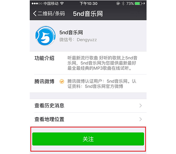 當你掃描后會打開“5nd音樂網(wǎng)”公眾號,如下“圖四”,然后點關(guān)注