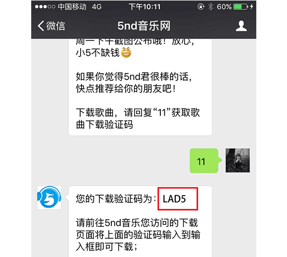 關(guān)注后會進入“5nd音樂網(wǎng)”微信公眾號,然后輸入“11”,如下“圖五”。